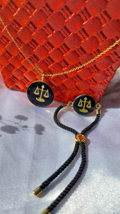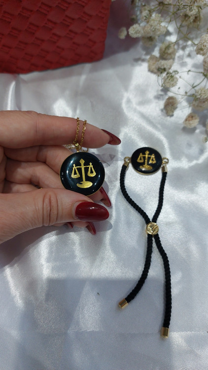 نیم ست گردنبند و دستبند رزینی نماد ماه تولد مهر قاب برنجی زنجیر استیل رنگ ثابت بند دستبند آسانسوری قابل تنظیم جنس کنفی رنگ مشکی همراه با جعبه خرید به صورت آنلاین سایت و اینستاگرام