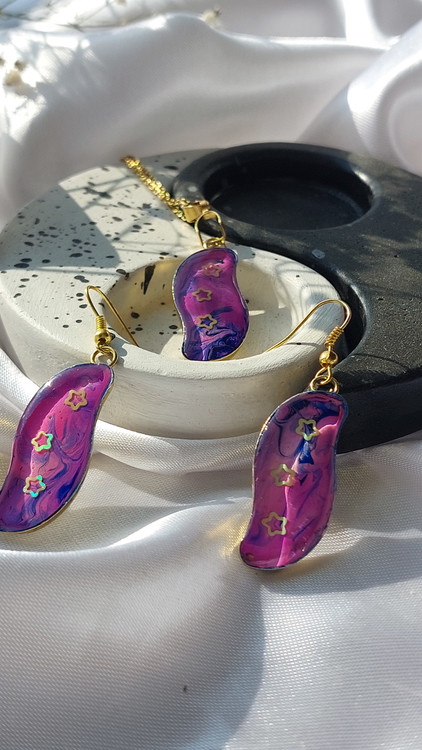 نیم ست زیورالات رزینی رنگ بنفش شامل گردنبند و گوشواره با قاب برنجی و زنجیر استیل رنگ ثابت به همراه جعبه مناسب برای کادو دادن خرید به صورت آنلاین و سایت