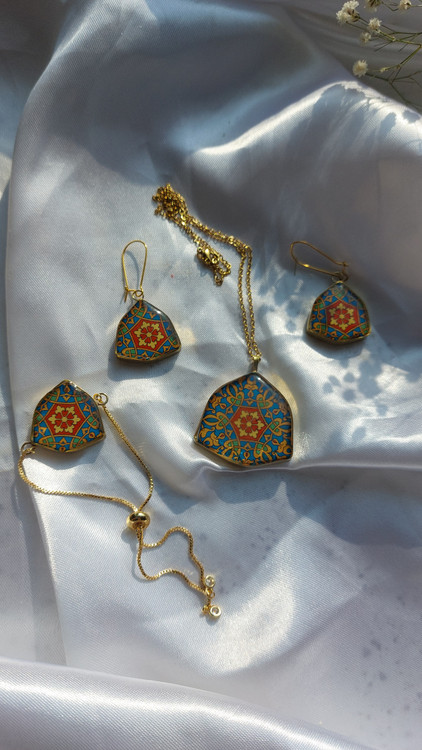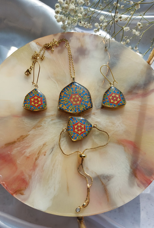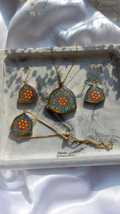 ست کامل زیورالات رزینی طرح سنتی رنگ آبی شامل گردنبند با قاب برنجی و زنجیر استیل رنگ ثابت، دستبند با قاب برنجی و بند آسانسوری قابل تنظیم، گوشواره با قاب برنجی به همراه جعبه مناسب برای کادو دادن خرید به صورت آنلاین و سایت