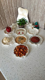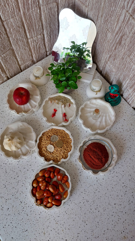 هفتسین سنگی طرح صدف رنگ سفید و اکلیل طلایی شامل آینه دفرمه با پایه چوبی، دو عدد جا شمعی، ۶ ظرف طرح صدف و یک ظرف صدف با ماهی رزینی مناسب برای سفره های شب عید و کادو برای عروس خانمها در ضمن بعد از عيد از ظرفها به عنوان جاشکلاتی، تنقلات و جای زیورالات میتوان استفاده کرد خرید به صورت آنلاین و سایت